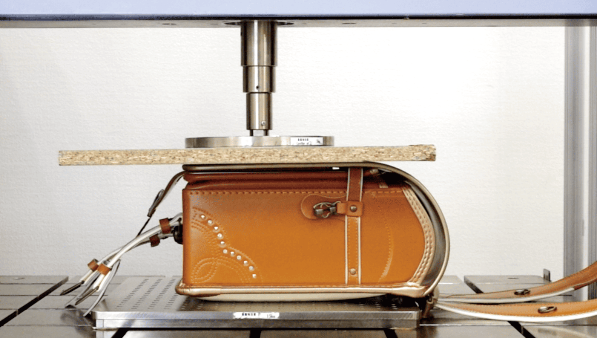 日常の学校生活でかかる力を想定し、ランドセルの形状を保てるかを確認しています